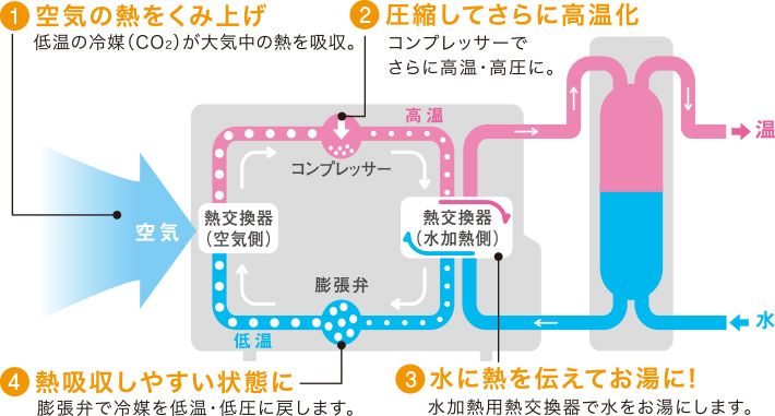 電気も使いますが、お湯を温めるための熱は、空気中の熱を使っているので、ガスを使って直接お湯を温めるガス給湯器よりもかなり少ないエネルギーで給湯することができるのです。
