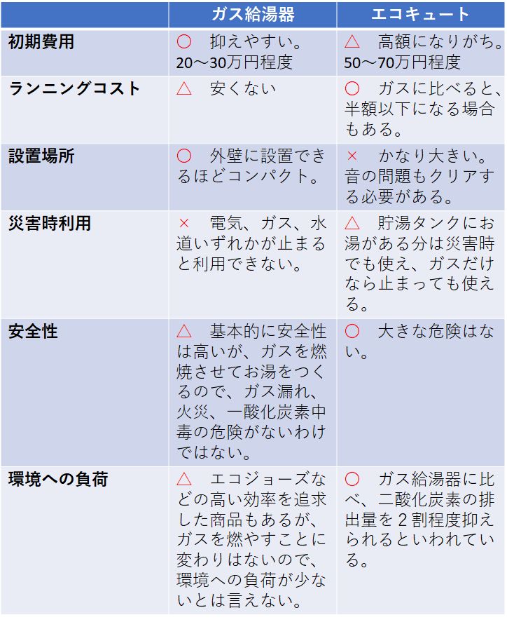 それでは、それ以外の条件をガス給湯器と比べてみましょう。