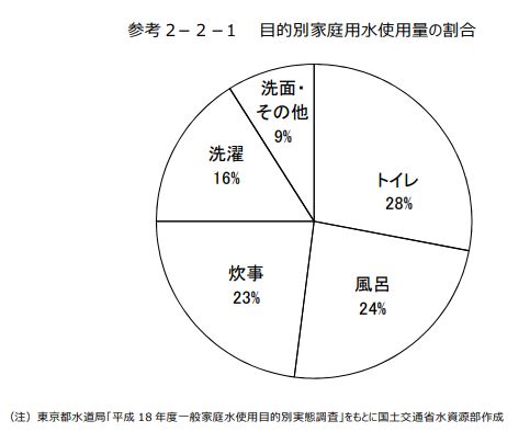 この東京都の使用割合の数字ですが、今から18年前のものを、当時の国土厚生省が引用していました。それによると、当時、最も使用量が多かった設備はトイレでした。その割合、28%。