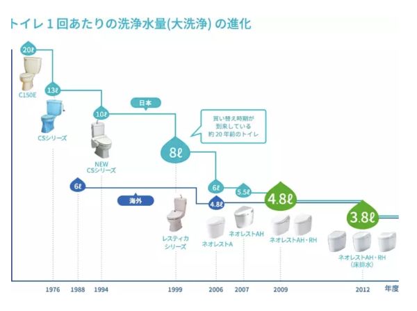 その後、1982年に「お尻だって洗ってほしい」でブレイクしたウォシュレットが登場し、今から30年前の1994年に10リットルまで減り、その5年後に8リットル、それ以降、徐々に減っていき、2012年に現在の3.8リットルまで、減らすことを実現しました。