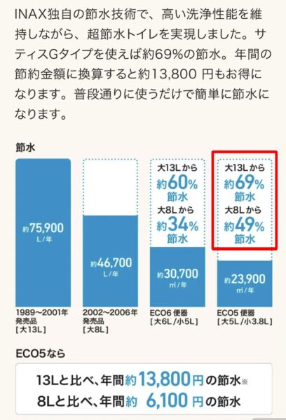 これによると、30年前のトイレで70%、20年前のトイレで約50%の節約となっています。
