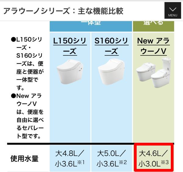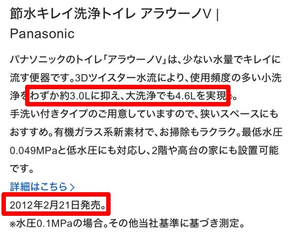 トイレの三大メーカーの一つ、残るパナソニックのアラウーノも、最新の洗浄水量は、TOTO、LIXILとさほど変わらない量で、小洗浄約3.0リットル、大洗浄約4.6リットルとなっています。