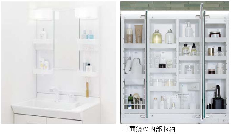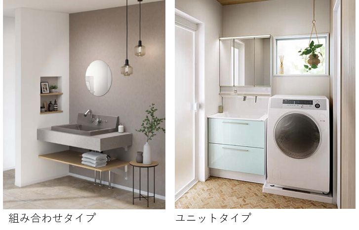一般的なのは、三面鏡と、洗面台、下部収納がセットになったもの。もうひとつは、それらを個別に選び、組み合わせるタイプ。
