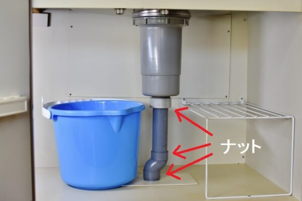 交換するにはまず、シンク下の排水トラップの上部にあるナットを反時計回りにまわして、外します。