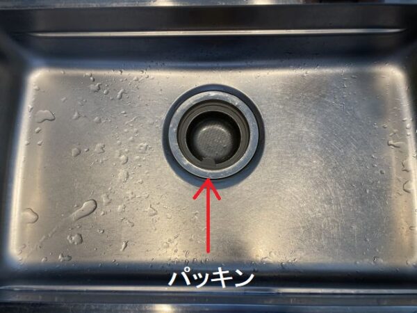 キッチンのシンク内部にある排水口の金属が重なる部分には、パッキンが挟まっていて水が漏れるのを防いでいます。