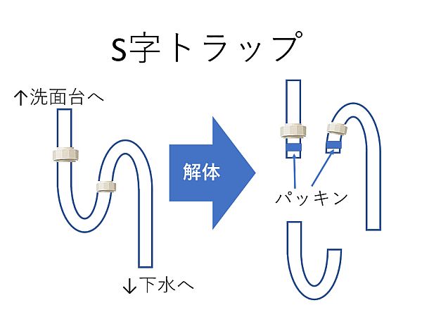 S字トラップとは、下水の嫌な臭いが室内に充満するのを防ぐために、下水と洗面台の排水口との間に流れた水を溜めて、悪臭を封じ込める仕組みです。