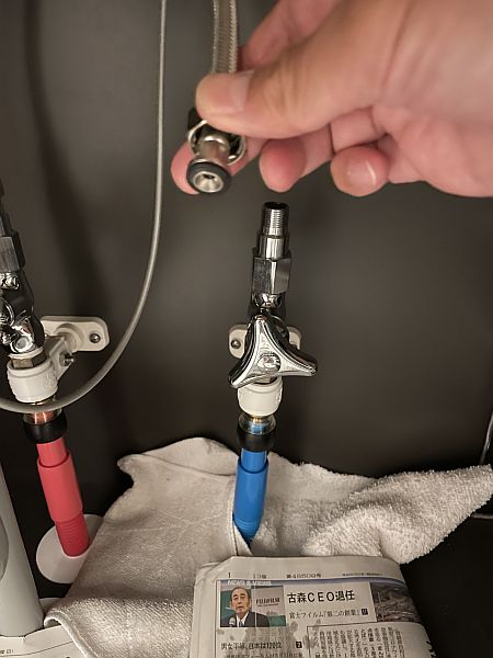 2-1.まずは、給水口の元となる給水栓を閉めます。給水栓はお湯と水に分かれています。当然ですが、漏れている方のハンドルを閉めます。給水栓を閉めても水が跳ねる場合がありますので、必要に応じて新聞紙やビニールシートで養生を行います。