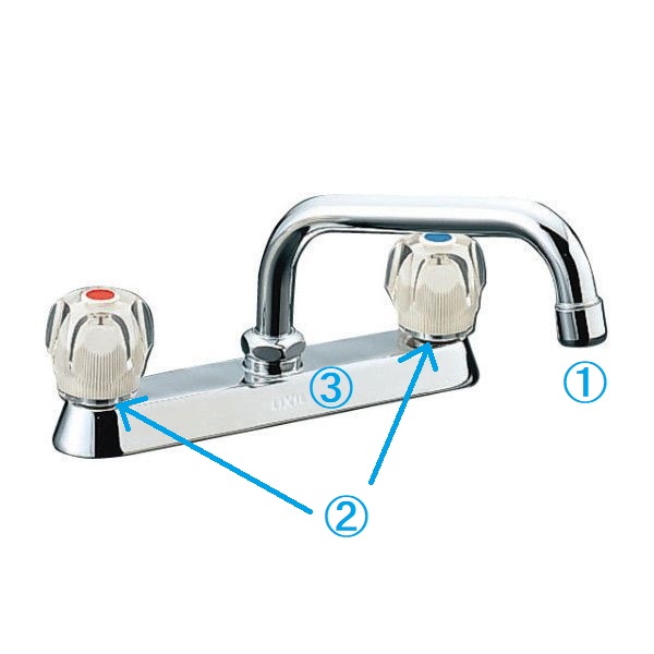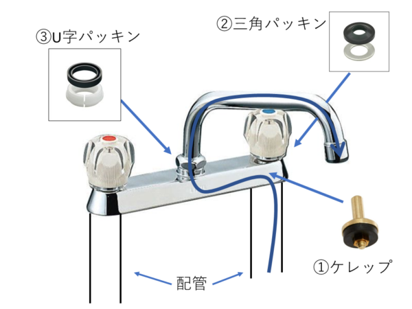 台付き2ハンドル水栓の場合、交換するケレップ・パッキンは3か所あります。