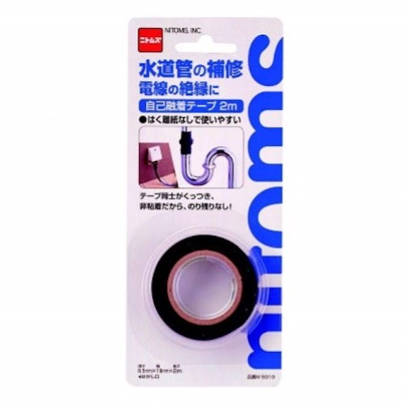 3. 癒着テープを用意し、3回程度以上、グルグルと巻きつけます。自己融着テープはブチルゴムという合成ゴムでできています。普通のビニールテープのように接着剤は使われていません。引っ張りながら巻きつけることで、テープとテープの間にできるほんの少しの隙間にブチルゴムが流れ出し、完全に一体化します。それゆえ、防水性や電気の絶縁性が高いため、水道管の補修や、電線ケーブルの処理などに用いられます。一旦巻き付けた自己融着テープを取り外すには、カッターなどで切って除去するほかありません。