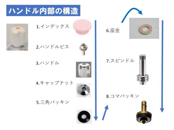 ほとんどの場合、ハンドルからの水漏れは、5.三角パッキンと8.コマパッキンを交換すれば解消します。