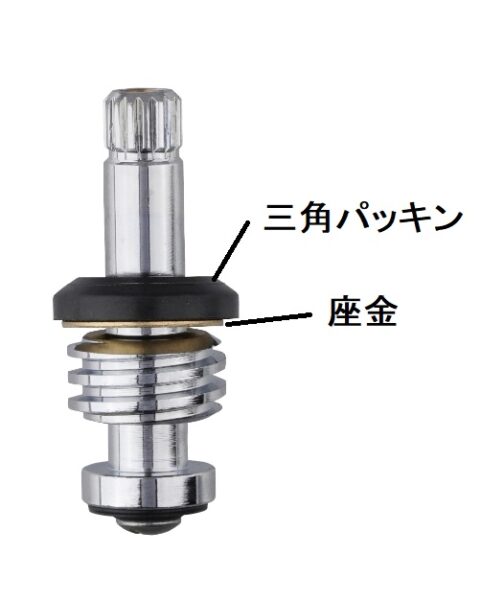 キャップナットを外すと、スピンドルに座金と三角パッキンが輪投げのように、真ん中の穴に入った状態になっているので、取り外します。